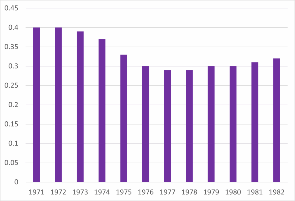 Fig. 2 Raw gap between female and male mean hourly earnings as proportion of male hourly earnings (manual labour, full-time employees). Source: derived from H. Joshi et al, Why Are More Women Working in Britain? Journal of Labour Economics, 3, 1 (1985), Table 6.