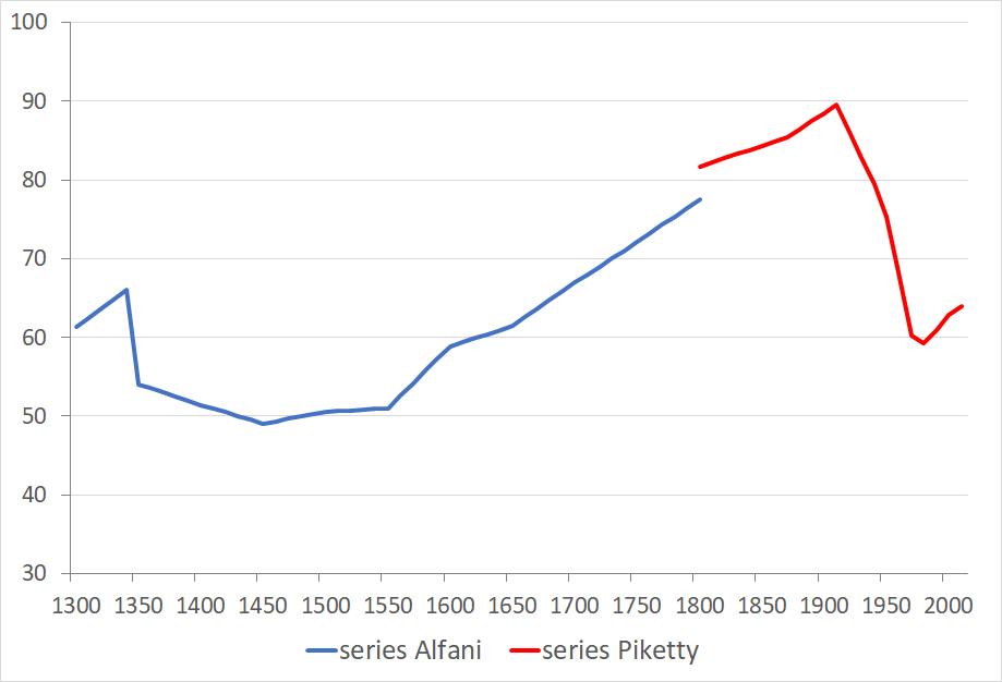 During the more than seven centuries covered by the figure, the Black Death triggered one of just two phases of systematic inequality decline (the other being connected to the two World Wars and the difficult interwar period). In the aftermath of the plague, the richest 10% of the population lost their grip on between 15% and 20% of overall wealth. This decline in inequality was long-lasting, as the richest 10% did not reach again the pre-Black Death level of control on overall wealth before the second half of the seventeenth century. The reduction in inequality had two main causes. First, the aforementioned increase in real wages of skilled and unskilled workers and the generally more favourable conditions experienced by labourers. Second, the fragmentation of large patrimonies caused by extremely high mortality in the context of the partible inheritance system, which in the late Middle Ages characterized many European areas, like Italy. This resulted in many people inheriting more properties than they needed or wanted. Consequently, it led to an unusual abundance of property being offered on the market. Together with higher real wages due to the scarcity of labour, this situation helped a larger part of the population gain access to property.