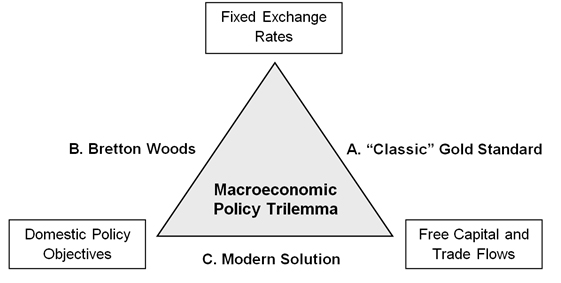 Figure 1: Diagram of the ‘Trilemma’. In solutions A, B and C only the two adjacent economic policy objectives can be achieved at the same time