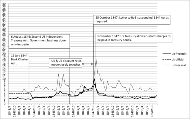 Figure 2 shows that UK interest rates closely matched US rates between April and October 1847― confirmation that the trilemma lay behind the crises of 1847. Afterwards, UK rates fell off slightly at the time Russell and Wood gave the Bank of England indemnity against unlimited issue of bonds, on 24 October 1847, so that exports of bullion were not necessary to meet foreign payments. Similar relaxations to the gold standard in the US allowed interest rates in the two countries to settle about 2 percentage points apart.