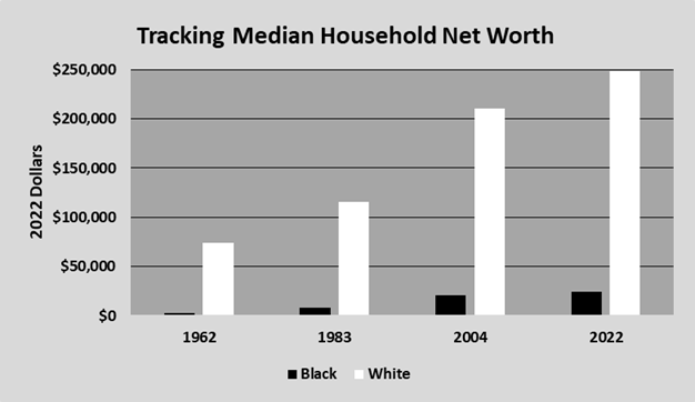 Planned and conducted while Jim Crow – the country’s system of legalized, racial segregation – remained ascendent, the published report considered how householder age, employment, and poverty status affected wealth, but no mention was given to race. Nonetheless, the survey results did offer a lucid portrait of Jim Crow America. The median White household possessed a net worth of $7,620 ($73,701 in 2022 dollars) while the typical Black household held only $295 ($2,853 in 2022 dollars). Almost one third of Black households held zero wealth or worse while less than one fifth of White households suffered the same. Strikingly, the survey showed that White households – on average – were expecting to receive an additional inheritance of $208 while Black households were anticipating $1. While dismaying, these results are unsurprising given our country’s history.